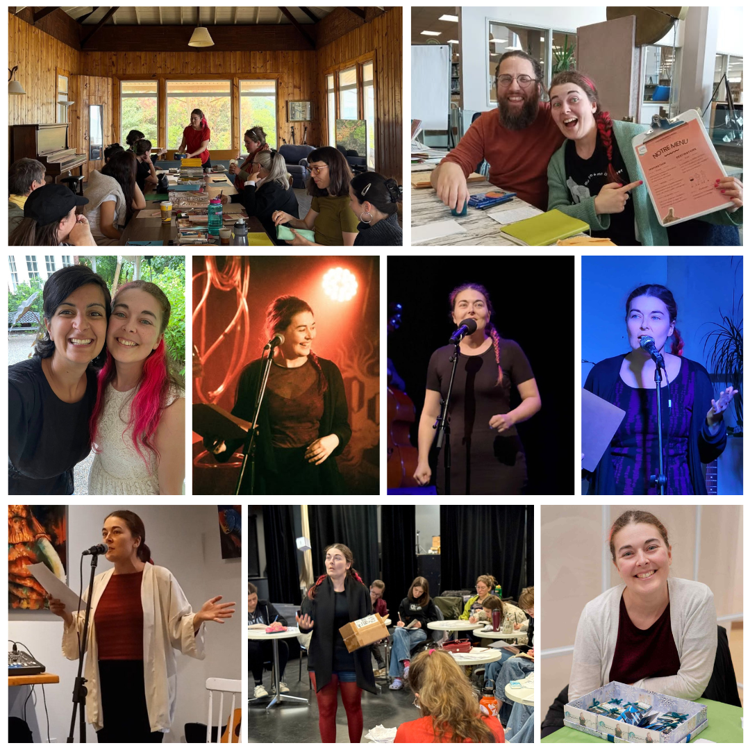 De gauche à droite à partir du haut, photos de : Éloïse Leblanc (Projet Borgitte), Bibliothèque Éva-Senécal de Sherbrooke (Journée du poème à porter), L’être persane (Manif au jardin, spectacle en plateau double à Uplands), Maxime Caron (Poésie poubelle), Victor Denoncourt (FISPA), Lis ta peau & cie (cabaret littéraire à Granby), Yves Verville (Café show à Eastman, Festival slam rap poésie & cie), Fransua Budro (Slam jeunesse) et Najwa Benchebab (marché des poètes au FISPA).